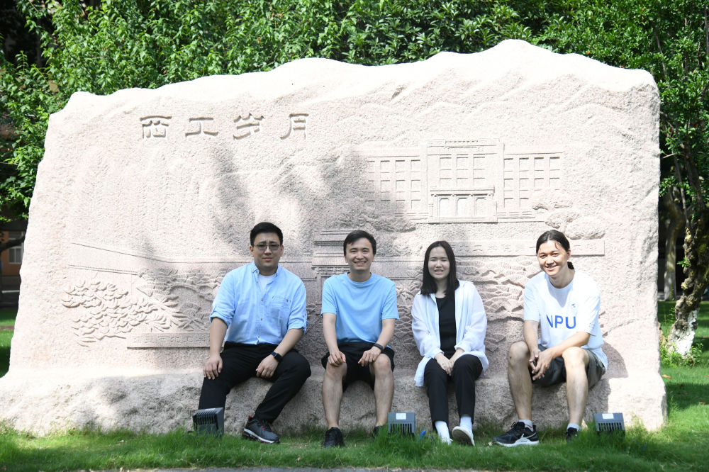 2024年6月26日,西工大哈萨克斯坦分校学生道托夫·铁木尔、博雷斯别克·穆拉特、伊萨耶娃·豪哈尔和图列加利·阿米尔(从左至右)在位于陕西西安的西北工业大学本部校园内合影。新华社记者 张博文 摄