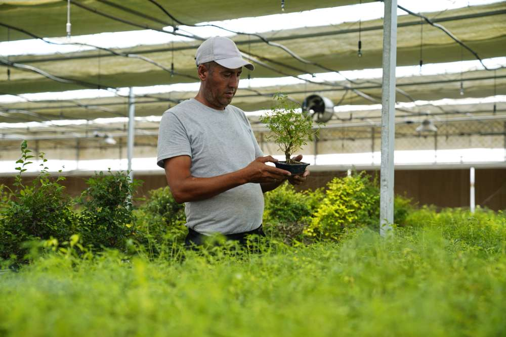 2024年7月28日,在乌兹别克斯坦锡尔河州的上合组织农业基地中乌现代农业科技示范园,工作人员检查盆栽植物。