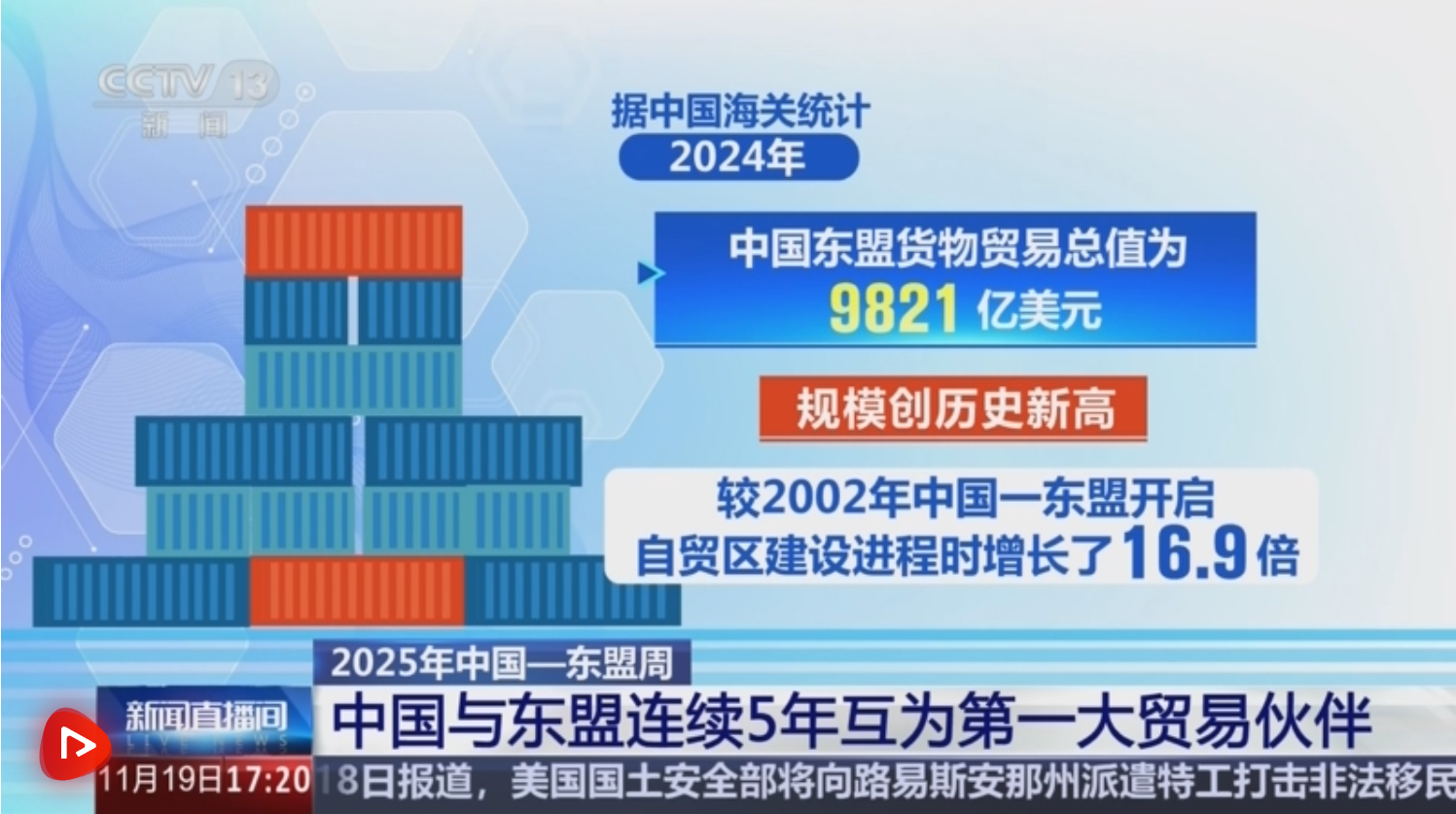 央视网消息:2026年将迎来中国—东盟全面战略伙伴关系建立5周年。从本月16日至19日,中国—东盟中心与福建省共同主办了“2025中国—东盟周”。中国与东盟连续5年互为第一大贸易伙伴,经贸往来蓬勃发展。