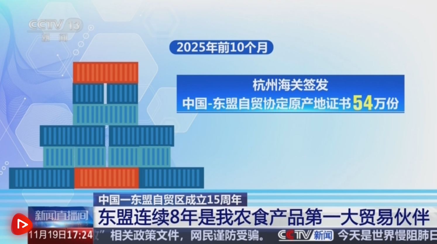 不仅进出口货物通关快,海关还积极推广“中国海关优惠原产地服务平台”,帮助企业充分享受政策红利。据统计,今年前10个月,杭州海关签发中国—东盟自贸协定原产地证书54万份,同比增长15.7%,助力企业在进口国享惠约80亿元。
